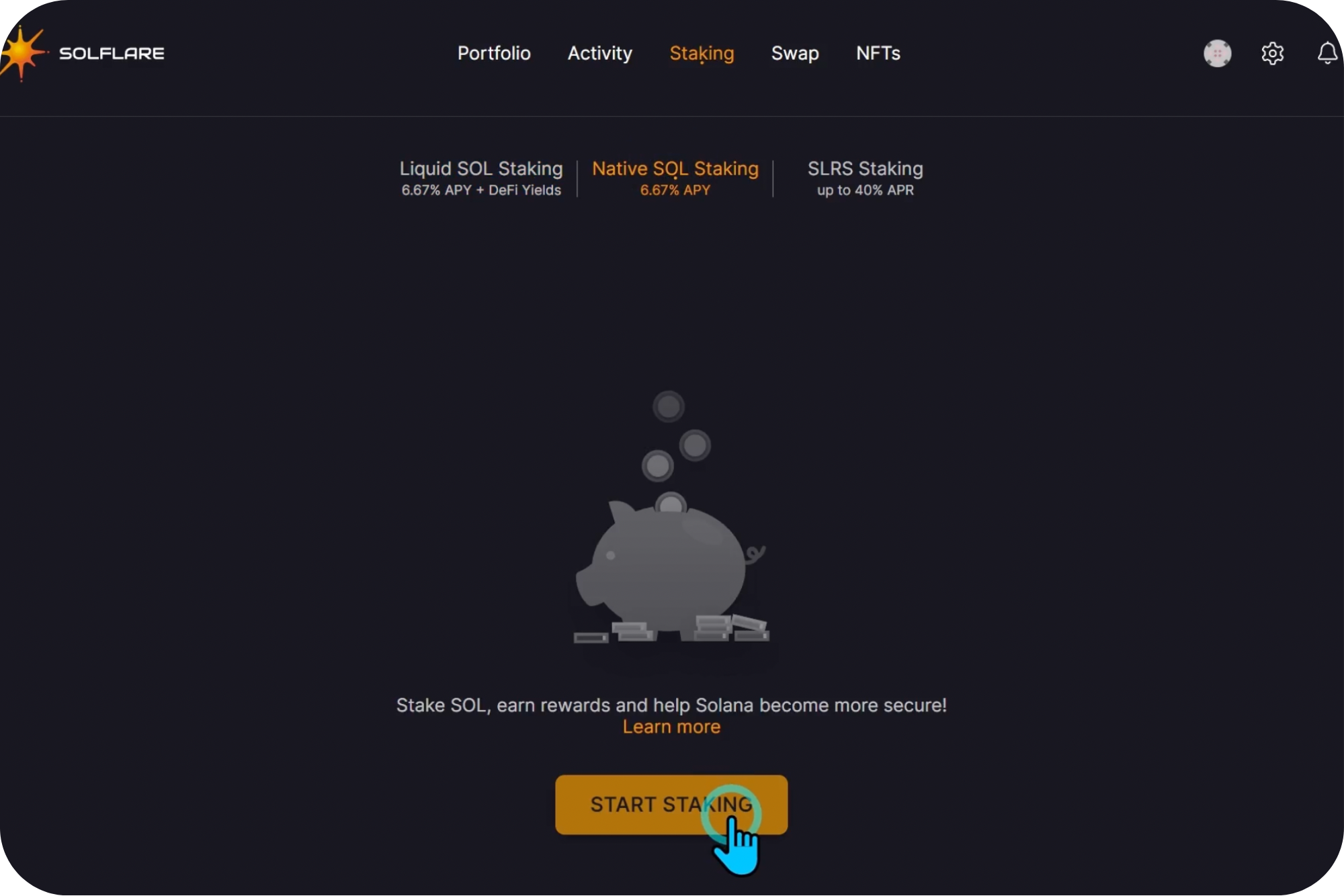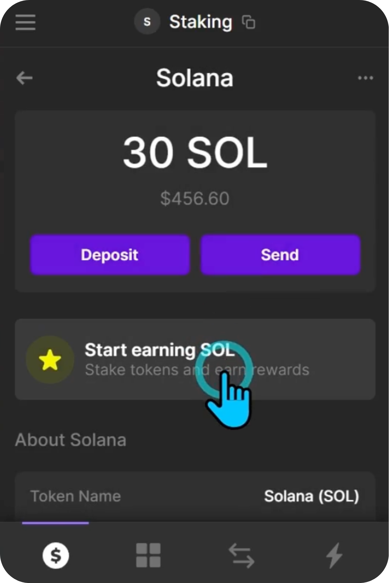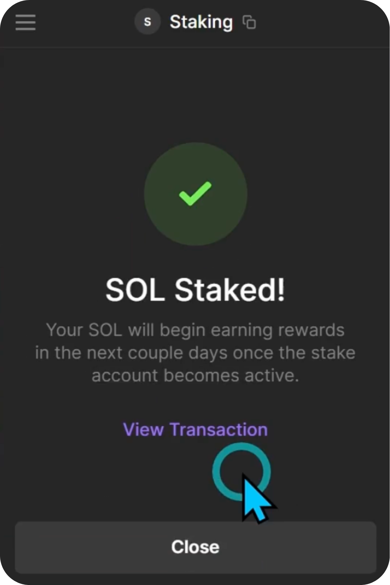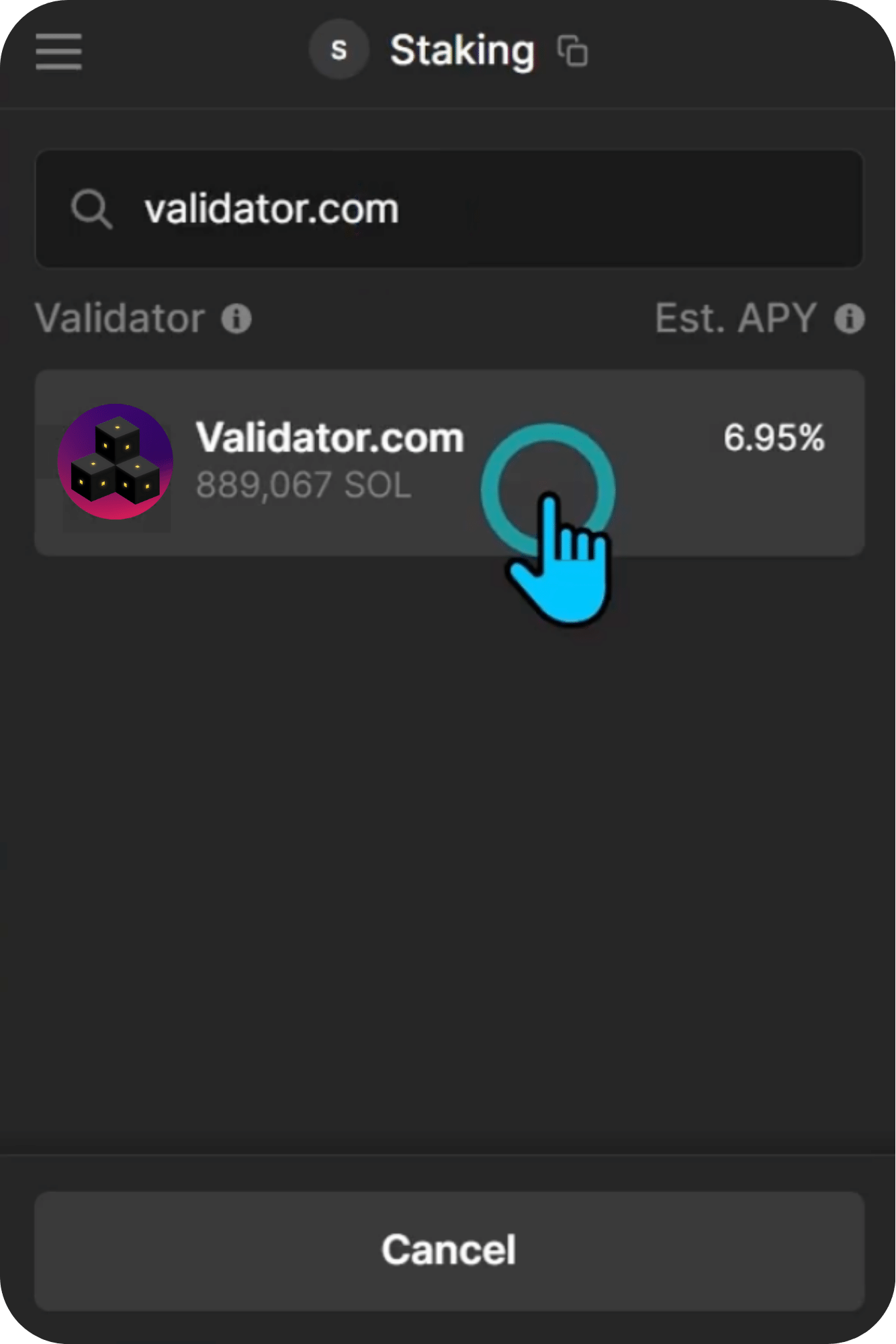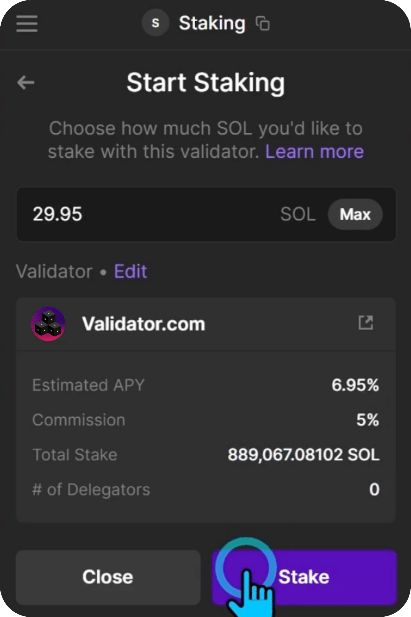 Staking is where you assign your "voting rights" to a unique Solana computer, called a validator, and earn a return of about 6.5-8% per year, as of June 2023. Voting rights are simply the ability to vote on a transaction, and each Solana token has these rights. The validator uses them to vote if a transaction was a good or bad transaction.