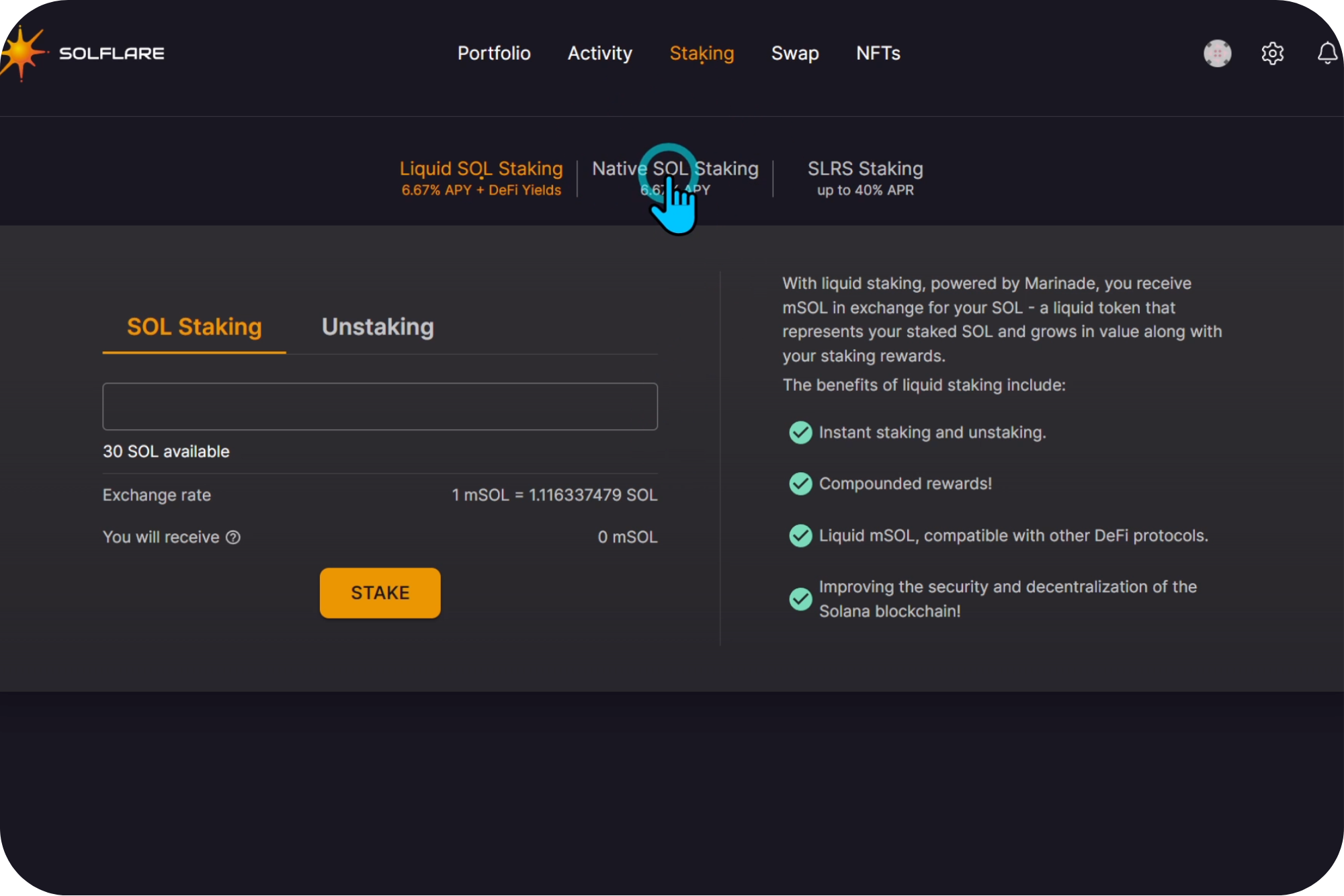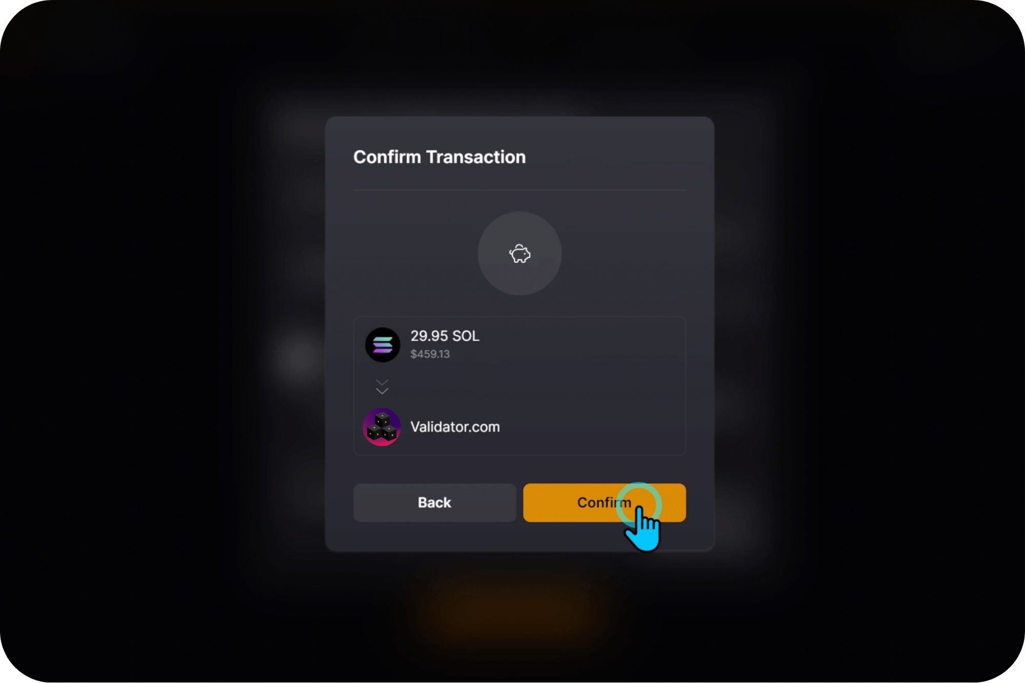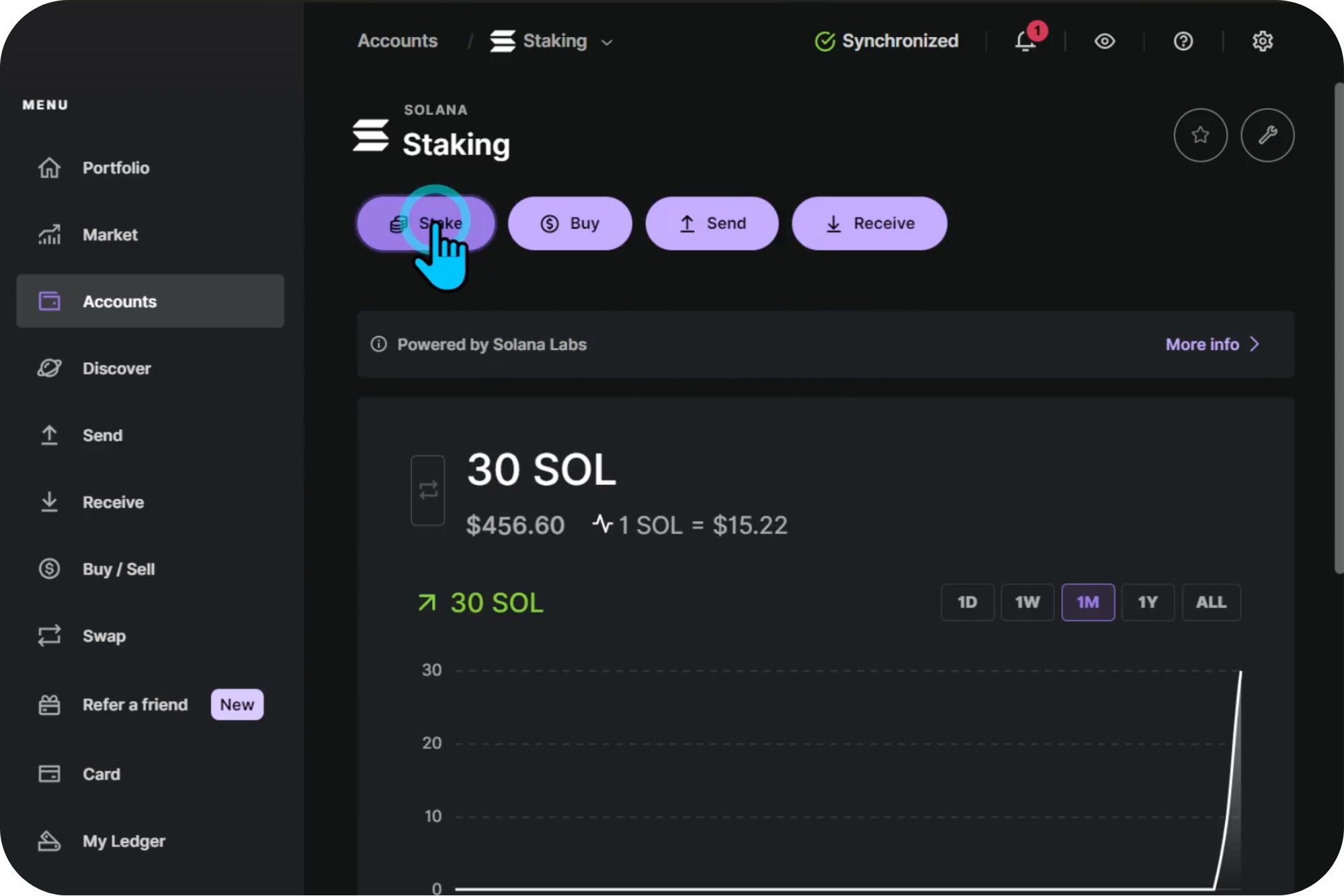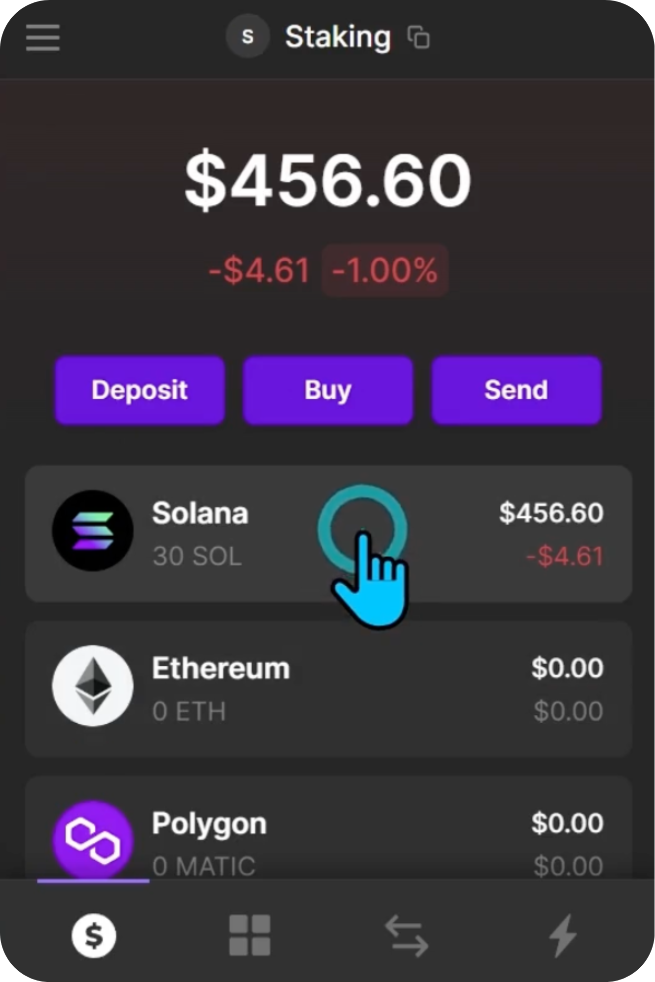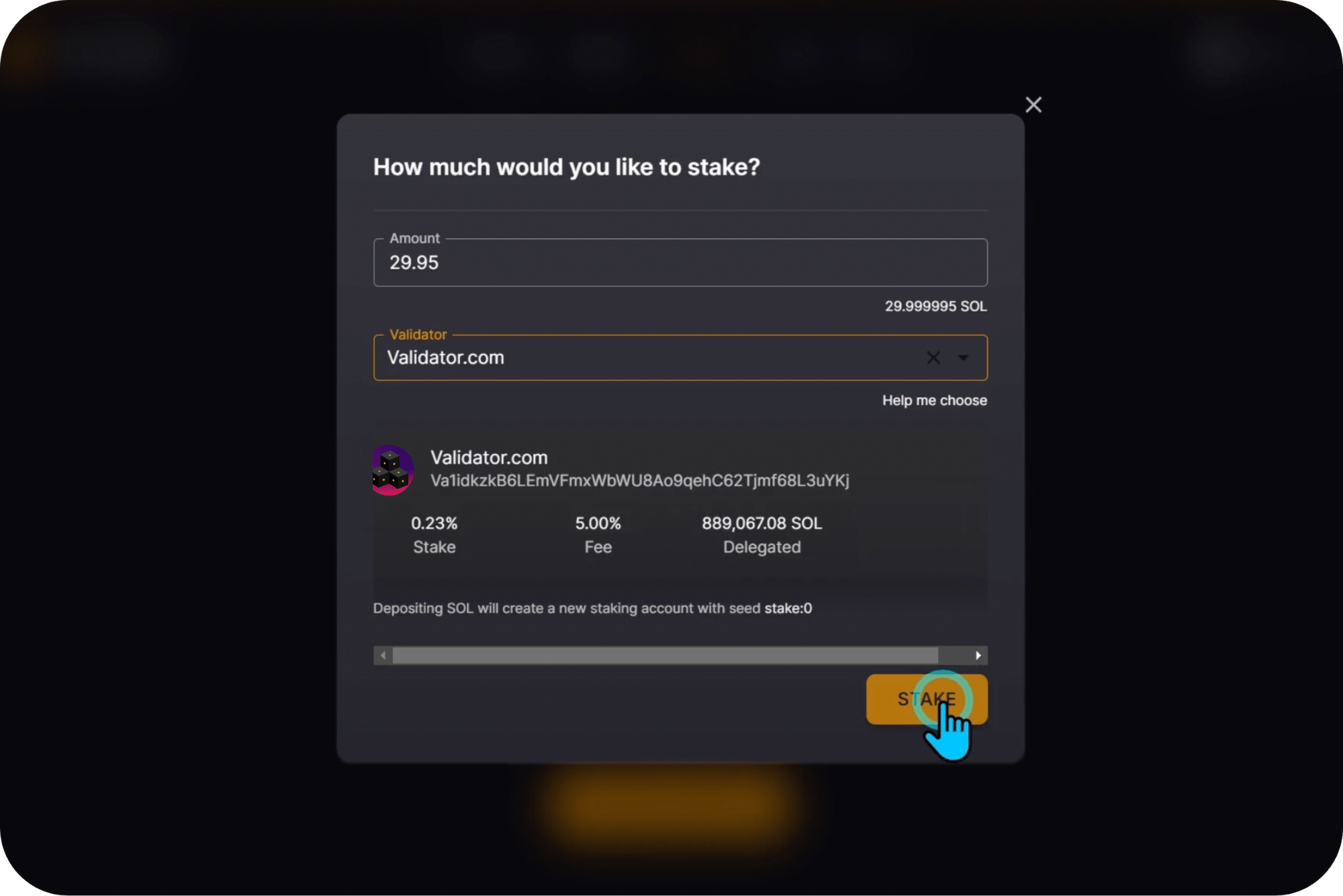 Staking is where you assign your "voting rights" to a unique Solana computer, called a validator, and earn a return of about 6.5-8% per year, as of June 2023. Voting rights are simply the ability to vote on a transaction, and each Solana token has these rights. The validator uses them to vote if a transaction was a good or bad transaction.